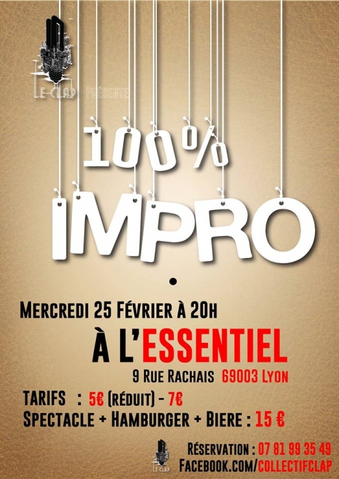 Comme tous les mois, retrouvez le 100 % IMPRO by le CLAP ! 8 Improvisateurs sans filets guidés par vos thèmes et accompagnés en musique live.