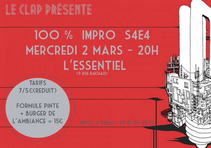 Eh bien voilà : le CLAP et la troupe d'improvisateurs ont retrouvé leur rythme de croisière (qui s'amuse, mais qui travaille aussi) : le 100% Impro de février est là, avec son lot de thèmes farfelus, de situations improbables, de MC déchaîné et de jeu électrique !