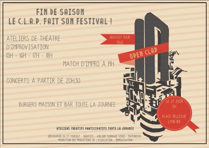 Le Clap présente son festival de fin de saison « Fête Place », il repose sur trois objectifs. Tout d’abord nous voulons valoriser les structures en lien avec les arts du spectacle implantées dans le 7ème arrondissement de Lyon. (écoles de théâtre et de technique, compagnies de théâtre et associations).